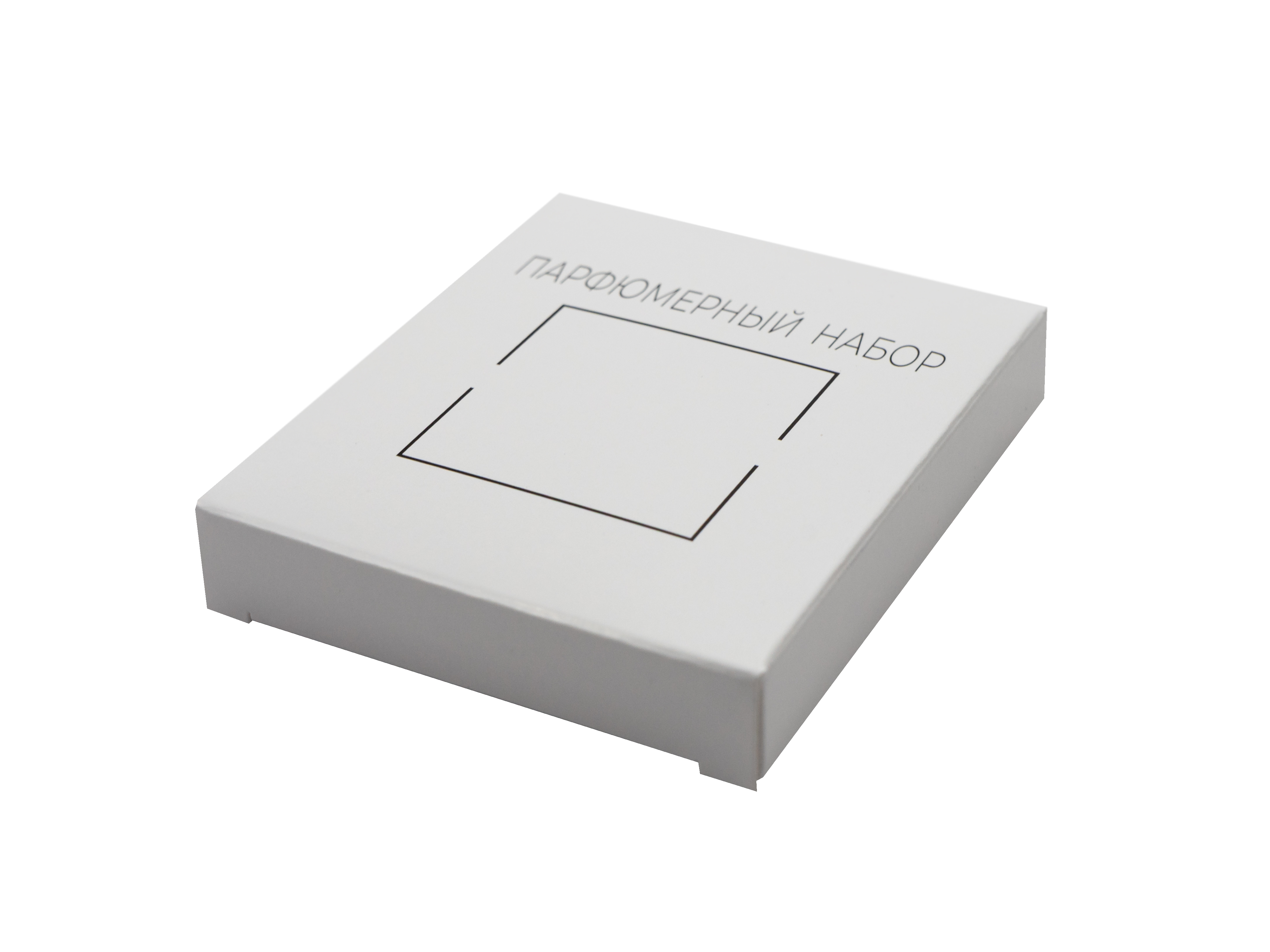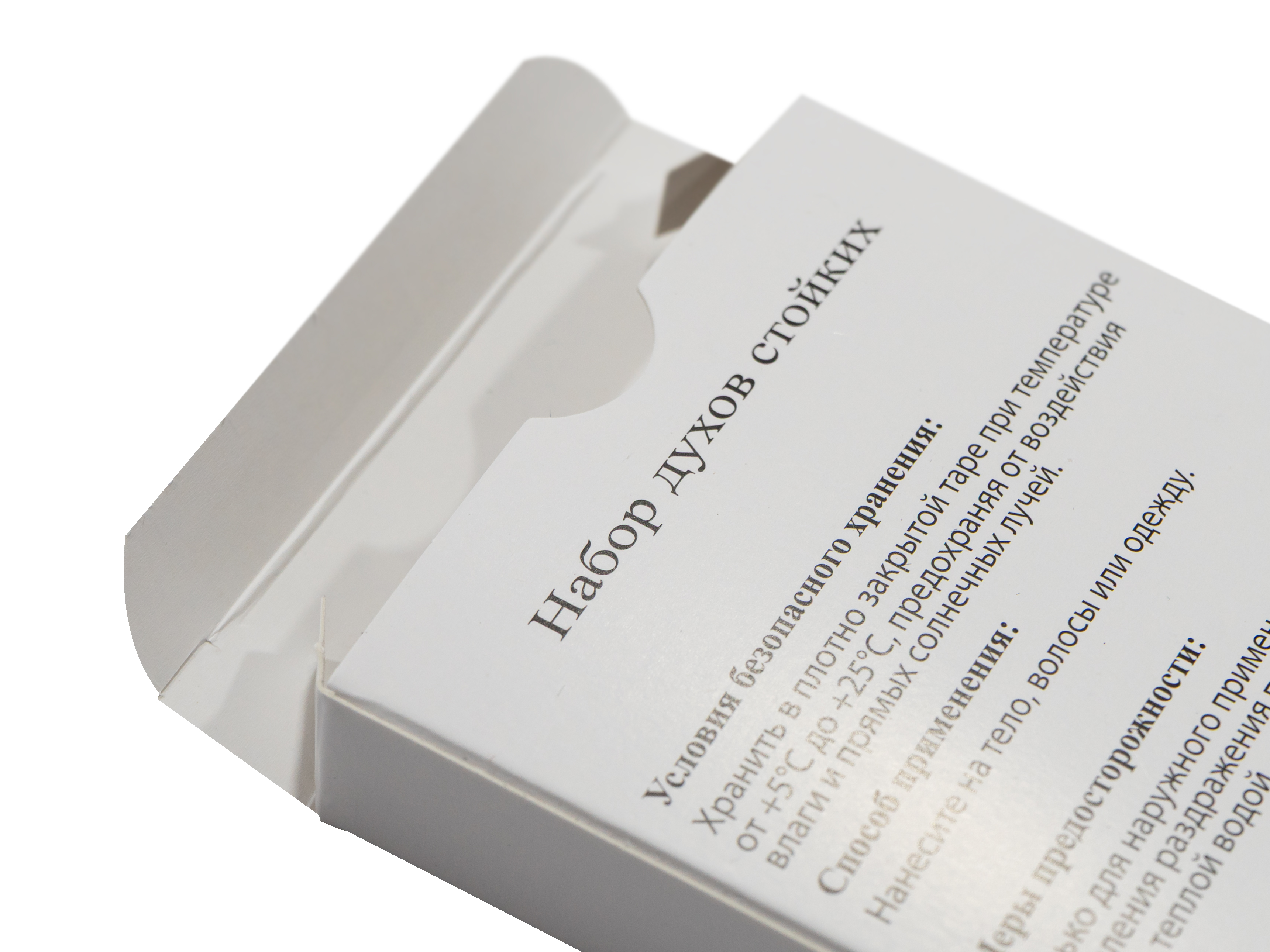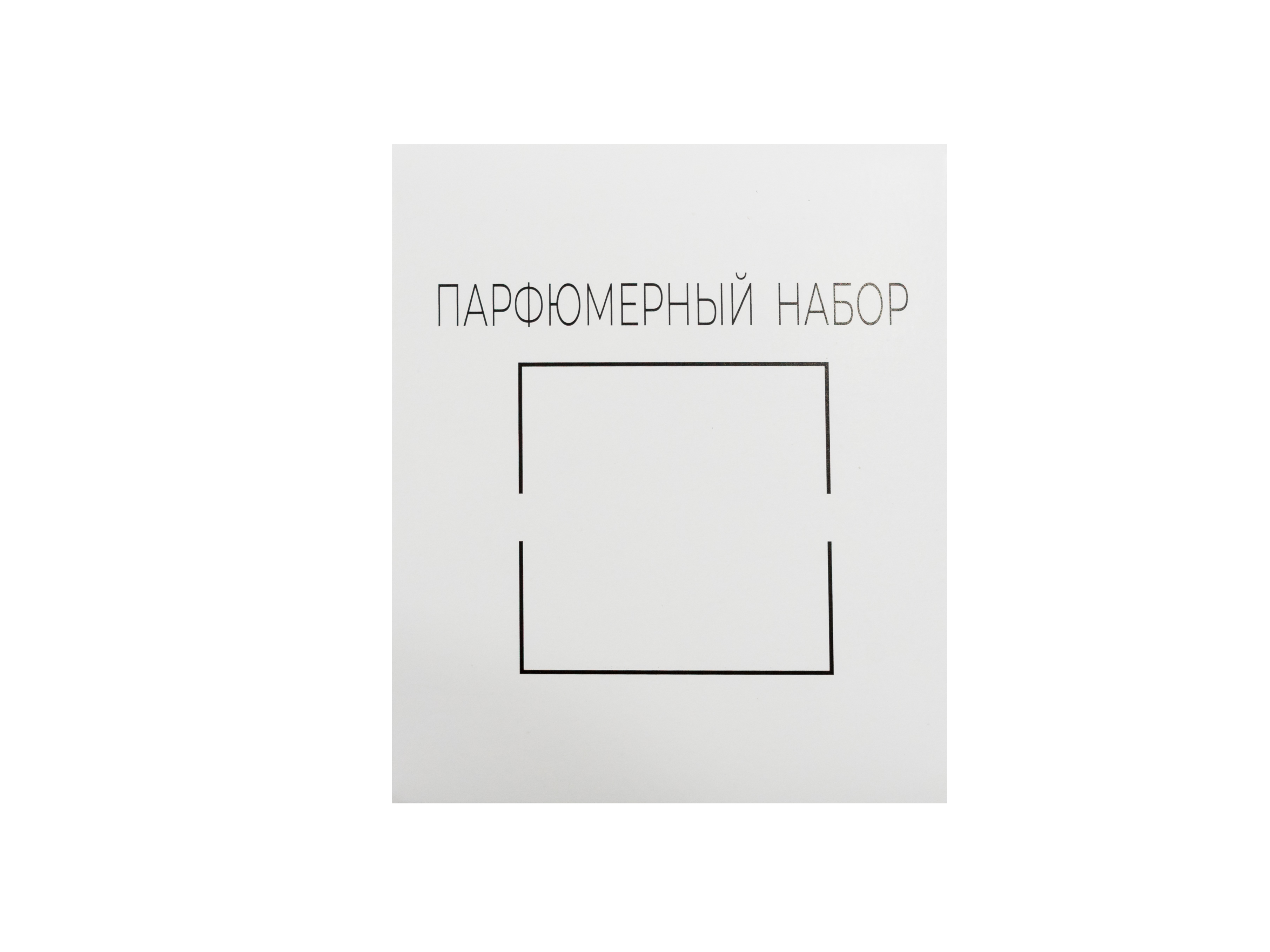Внутри предусмотрен ложемент из белого мелованного картона 270 г без печати, который фиксирует парфюмерные пробники и предотвращает их смещение. Конструкция предусматривает одну точку склейки, обеспечивая простоту сборки и аккуратность исполнения.