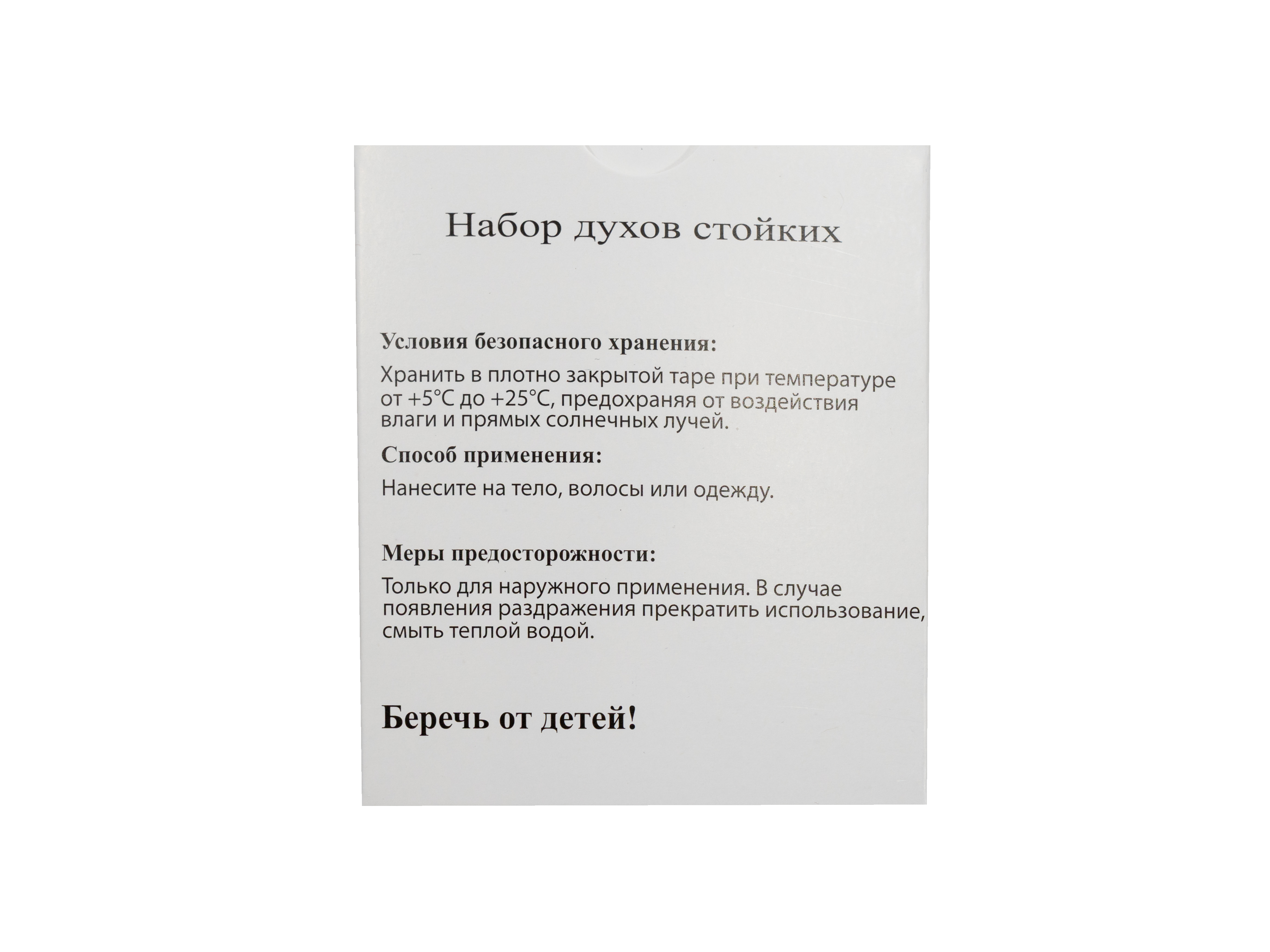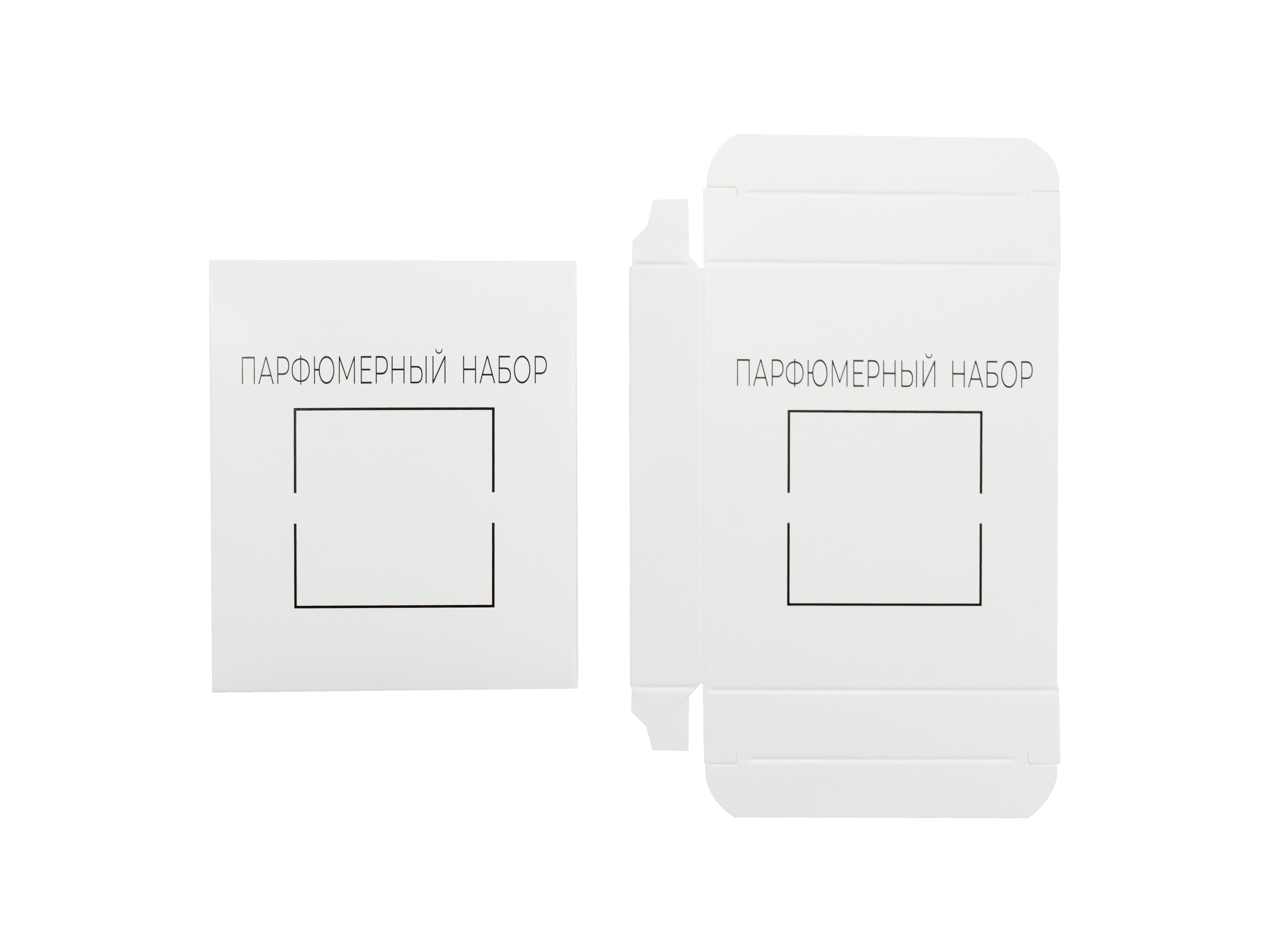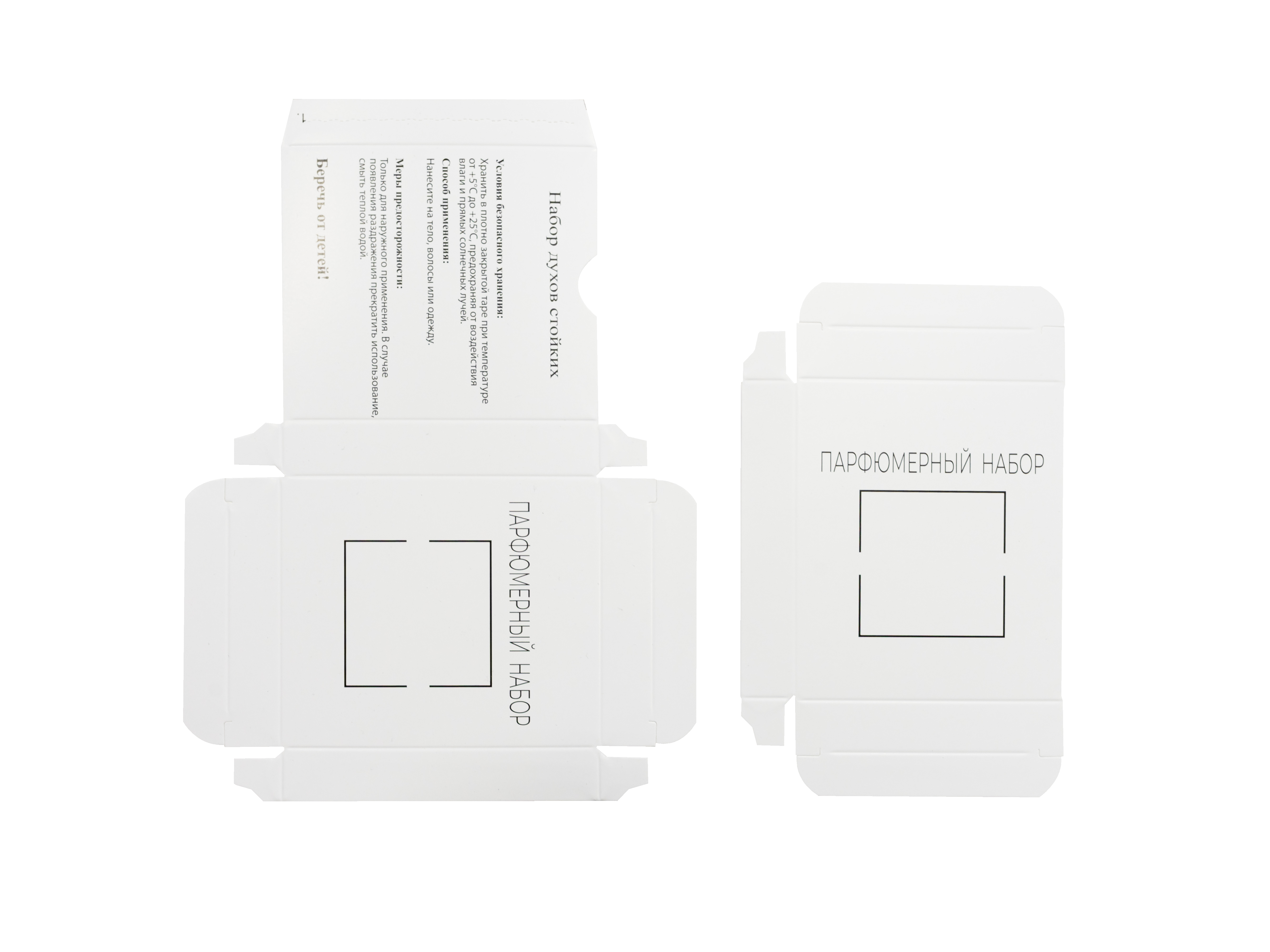 Внутри предусмотрен ложемент из белого мелованного картона 270 г без печати, который фиксирует парфюмерные пробники и предотвращает их смещение. Конструкция предусматривает одну точку склейки, обеспечивая простоту сборки и аккуратность исполнения.
